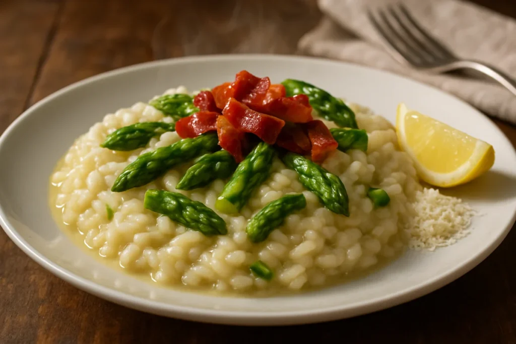 Scopri come preparare un risotto cremoso con asparagi e pancetta croccante in meno di 20 minuti, per un piatto raffinato e veloce.