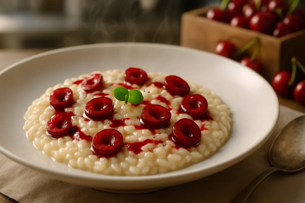 Scopri come il risotto alle ciliegie e pepe nero di Massimo Bottura unisce dolcezza e sapidità, creando un piatto sorprendente per la primavera.