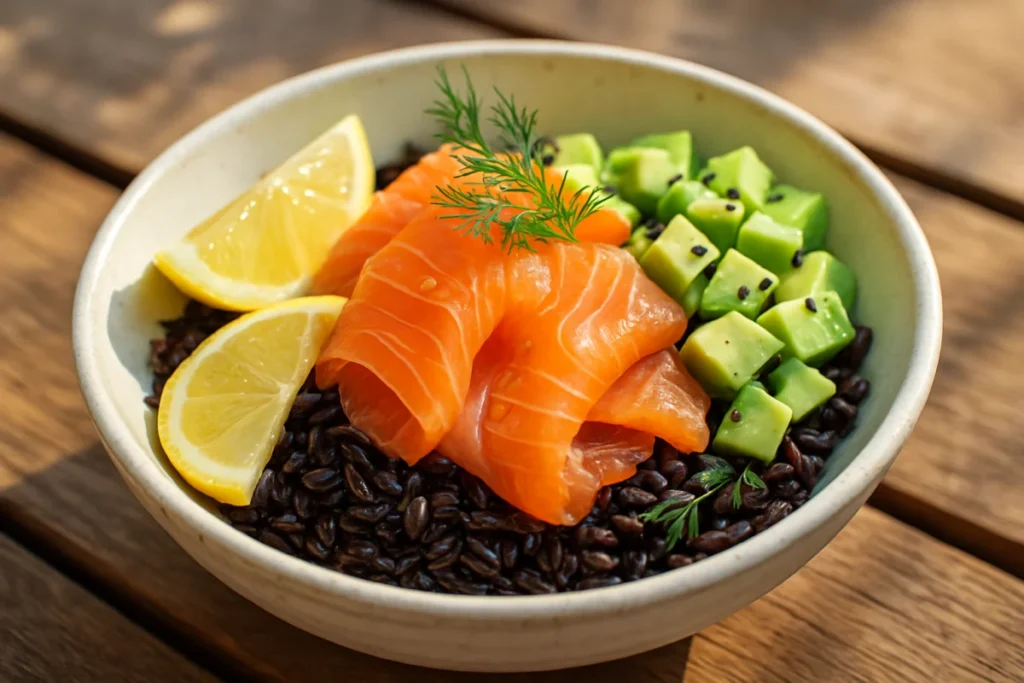 Per ottenere il massimo equilibrio tra sapore e praticità è importante scegliere ingredienti freschi e di buona qualità. Il salmone affumicato deve avere una fetta uniforme e non troppo secca; l’avocado deve essere maturo ma sodo per mantenere la forma. Le erbe aromatiche come aneto o erba cipollina aggiungono freschezza, mentre una nota di agrume con lime o limone sgrassa il palato. Per variare, si possono inserire piccoli cubetti di cetriolo per croccantezza, pomodorini datterini per acidità, o un tocco di semi come sesamo nero o semi di canapa per fibra e croccantezza. Se cerchi una versione vegetariana, sostituisci il salmone con tofu affumicato o con cubetti di feta stagionata per un effetto umami diverso. Troverai informazioni sulla varietà del riso Venere e la sua origine qui: Wikipedia – Riso Venere.